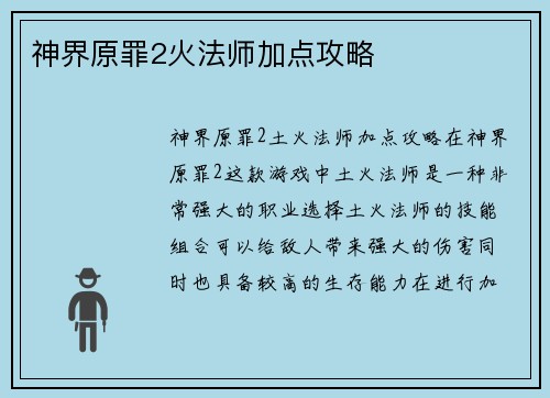 神界原罪2土火法师加点攻略 在《神界原罪2》这款游戏中,土火法师是一种非常强大的职业选择。土火法师的技能组合可以给敌人带来强大的伤害,同时也具备较高的生存能力。在进行加点时,我们需要考虑技能的输出能力...